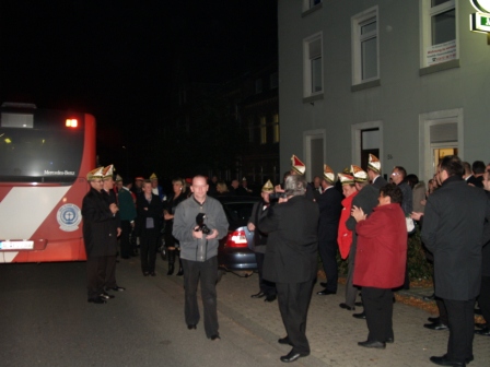 Mit dem oben bereits erwähnten Bus der Aseag fuhr die frisch gebackene Tollität zum Wachlokal "Alt-Stich". Hier hatte sich ein großer Teil der Narrenzunftfamilie versammelt und bereitete dem Prinzenpaar einen tollen Empfang. Stephan und Leo ließen es sich nicht nehmen und machten der Wachlokalwirtin Lotte eine kurze Aufwartung.