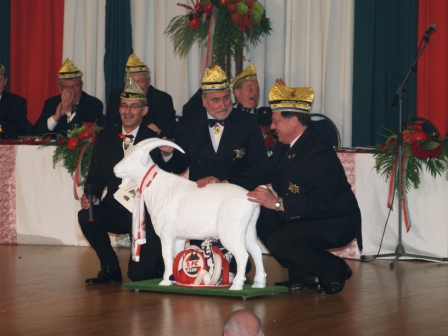 Einen weißen Plastikziegenbock in Lebensgröße (Ich glaube das Tier heißt Hennes, oder so ähnlich) erhielt dann der Bürgermeister aus den Händen des Prinzen. Bürgermeister, Komiteepräsident und unser Prinz Stephan teilen ihre Vorliebe für den Fußballverein aus Köln.